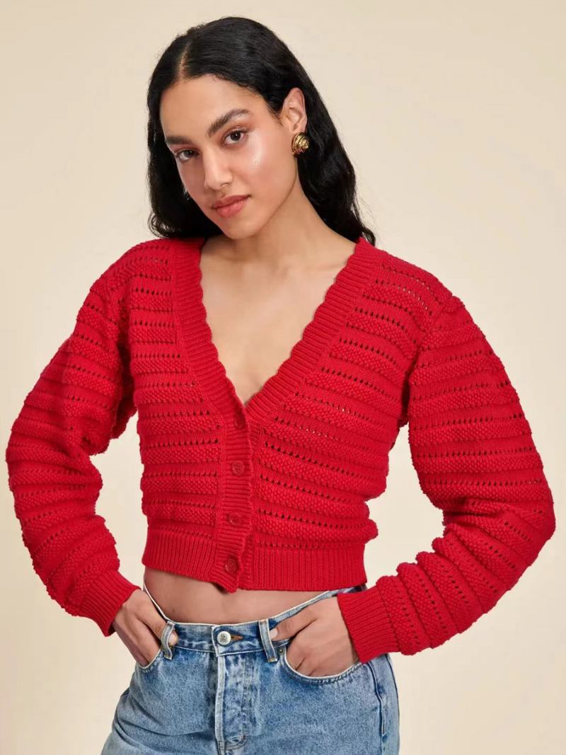 Suéter Vermelho Com Decote Em V Mangas Compridas Suéteres Curtos Para Mulheres