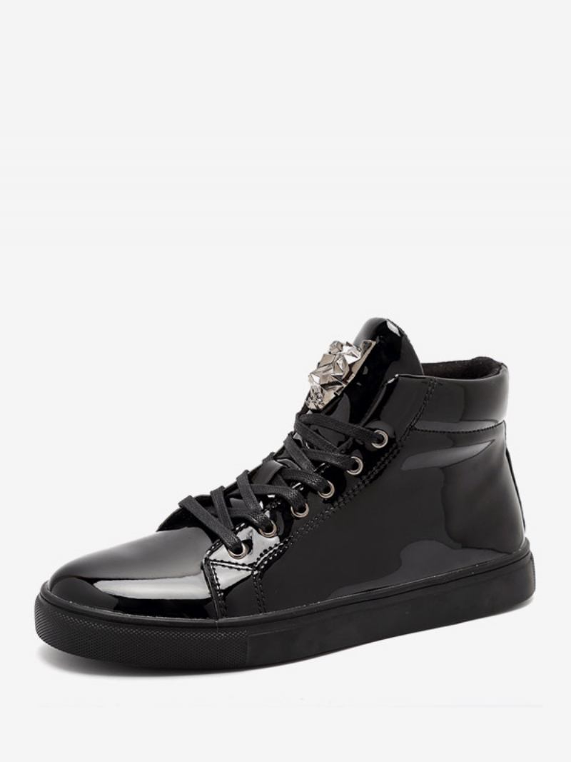 Tênis Masculino Aconchegante Em Couro Envernizado Com Bico Redondo E Detalhes Metal