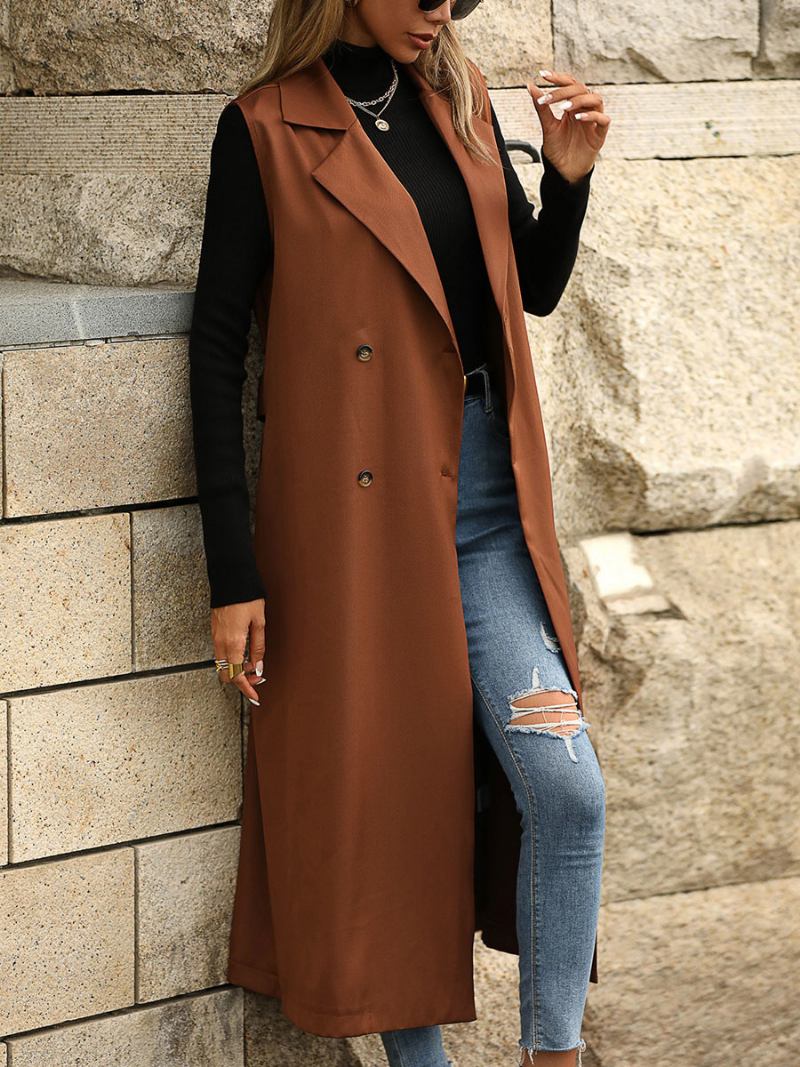 Trench Coat Café Marrom Sem Mangas Colete Longo Duplo Breasted Cinto Fino Ajuste Casual Primavera Outono Rua Outerwear Para Mulher