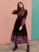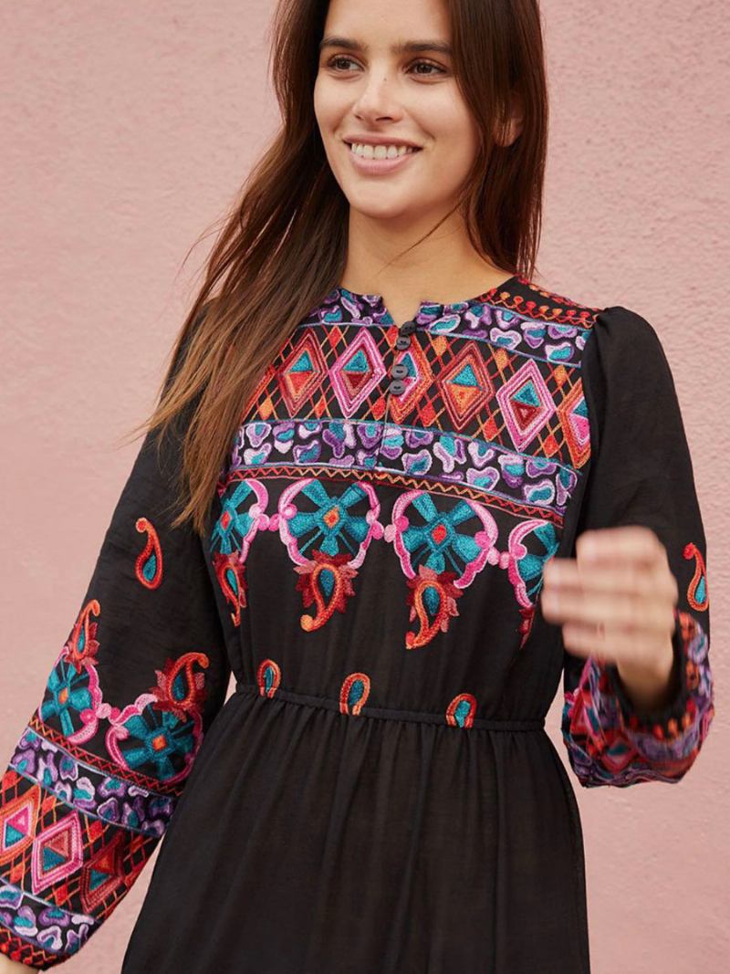 Vestido Boho Com Decote Em V Mangas Compridas Preto Bordado Boêmio Cigano Praia Férias Primavera Verão Longo Para Mulheres