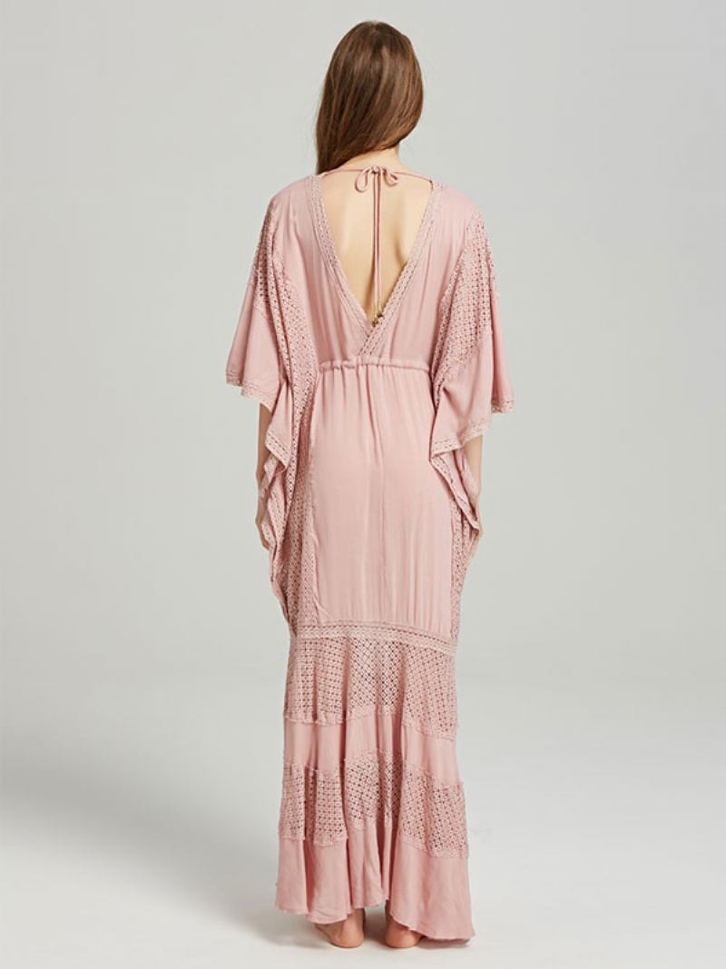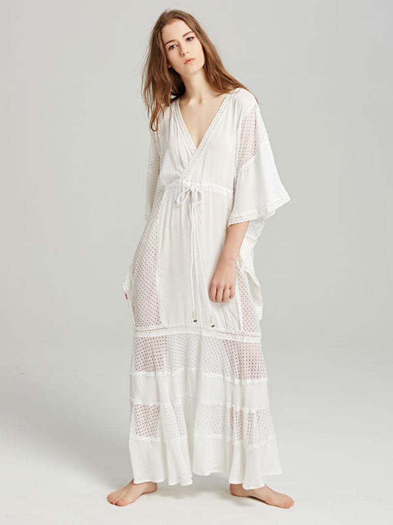 Vestido Boho Com Decote Em V Profundo Branco Mangas 3/4 Comprimento Boêmio Cigano Praia Férias Primavera Verão Maxi Para Mulheres