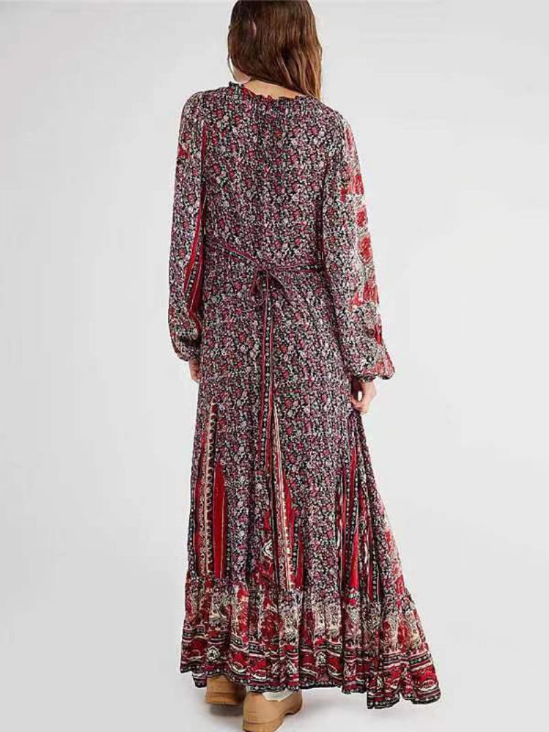 Vestido Boho Feminino Com Decote Em V Mangas Compridas Estampa Floral Verão Renda