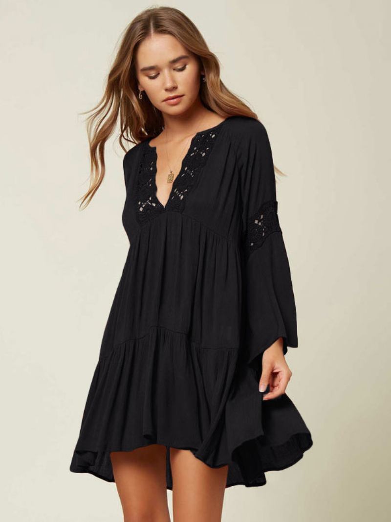 Vestido Boho Feminino Com Decote Em V Mangas Compridas Verão Recortado Grande