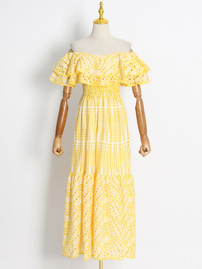 Vestido Boho Feminino Sem Alças Com Gola Bateau Mangas Em Camadas Renda Verão