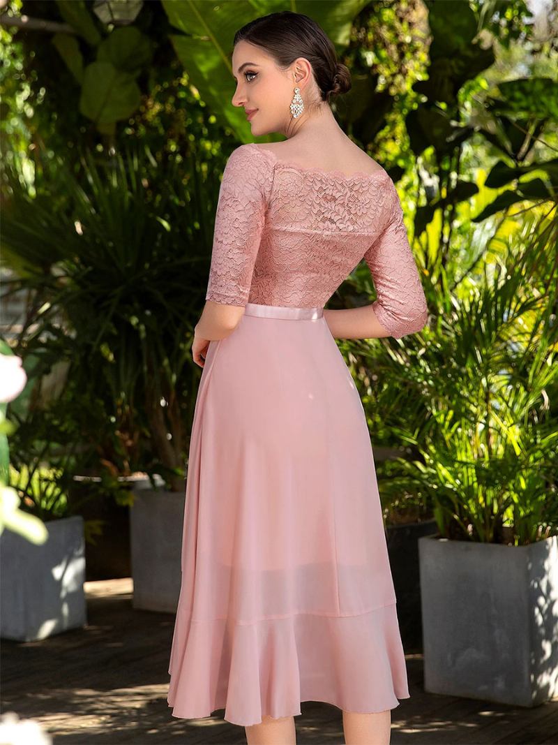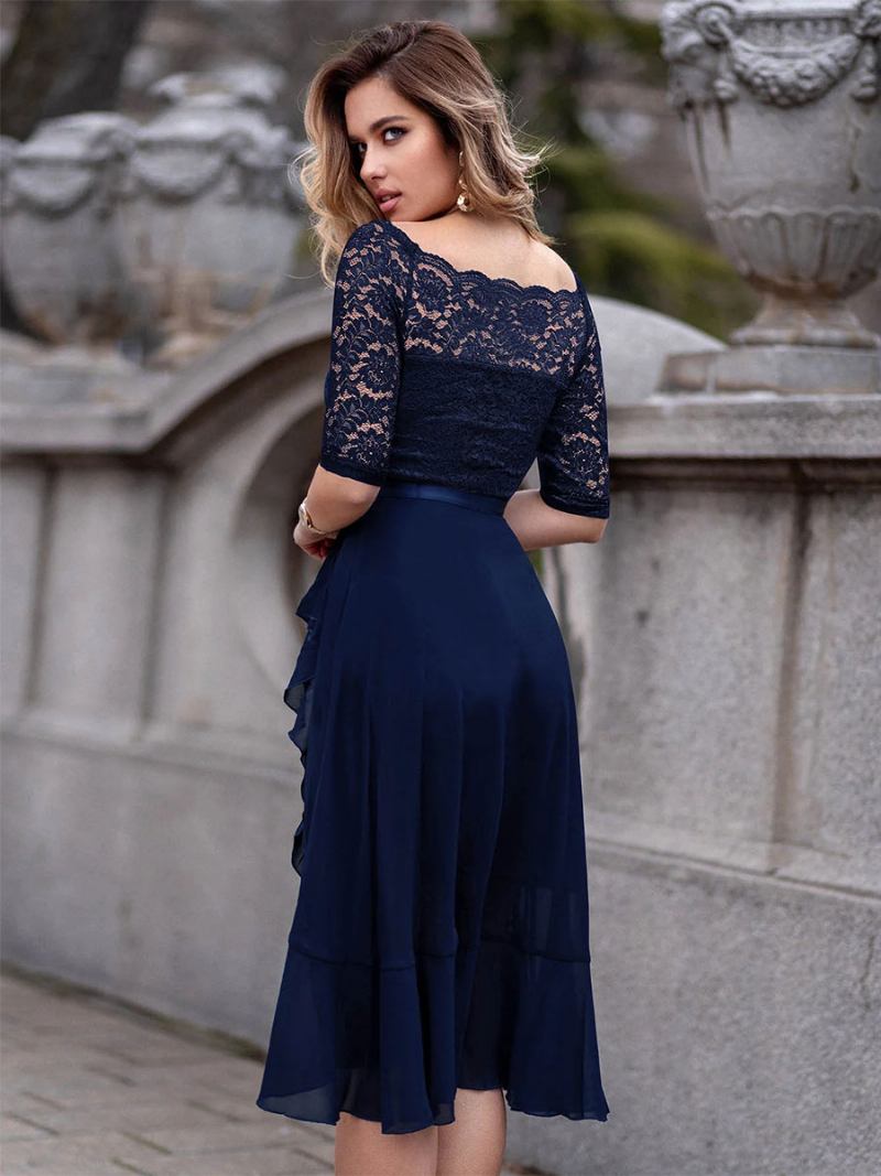 Vestido Curto Peplum Azul Escuro Feminino Corpete Renda Gola Canoa Cintura Vestidos Dia