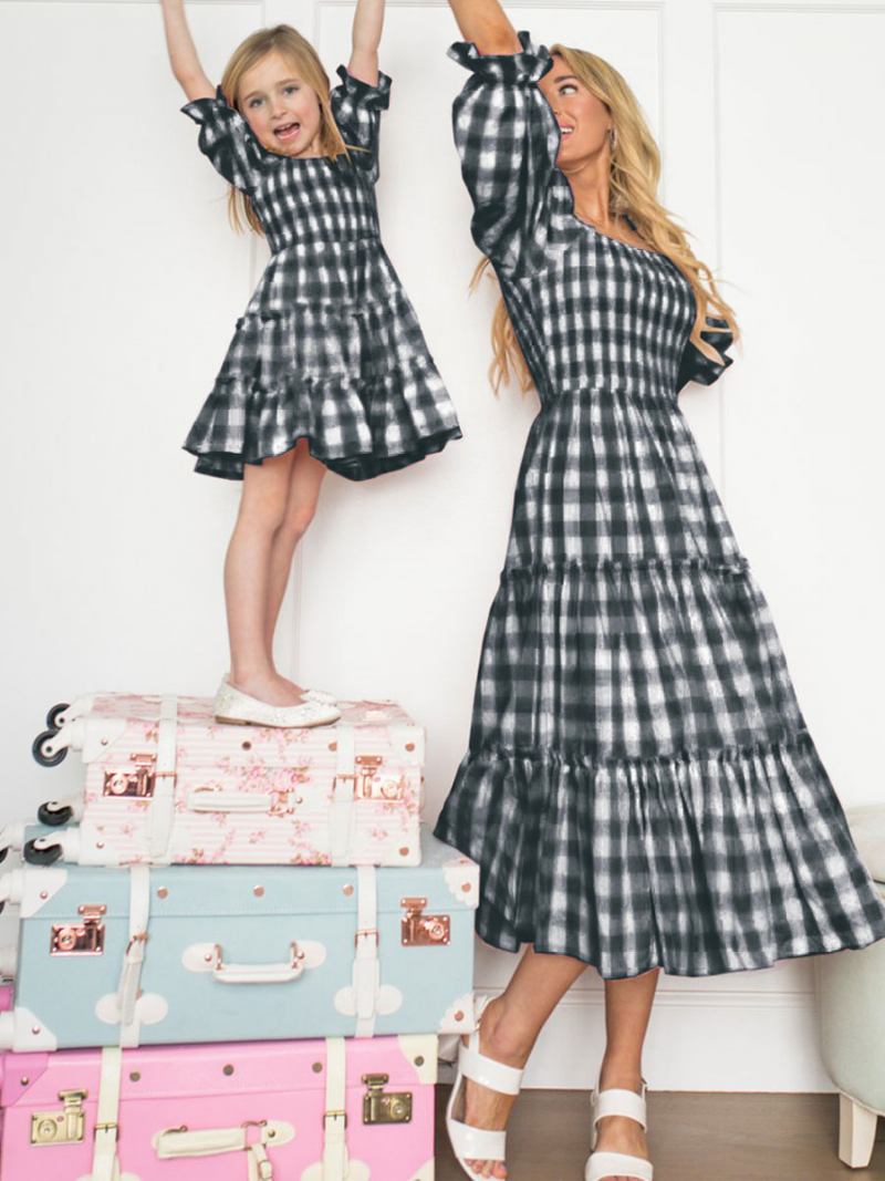 Vestido Feminino Barbie Rosa Guingão Para Pais E Filhos Com Gola Quadrada Xadrez Médio Verão