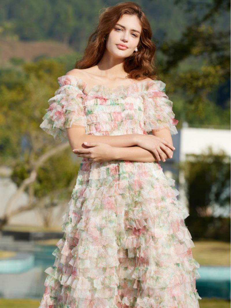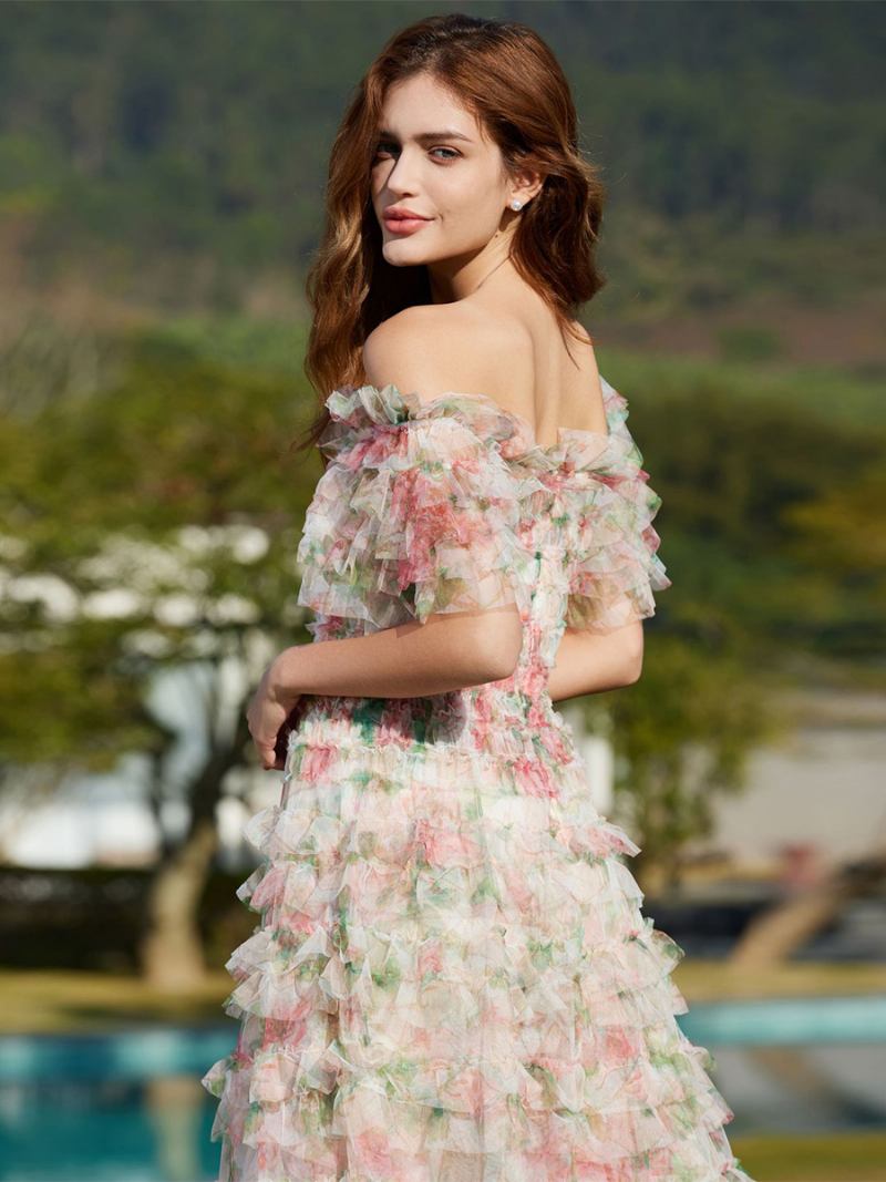 Vestido Feminino Com Babados Floral Tule Estampado Diário Casual Vestidos Verão