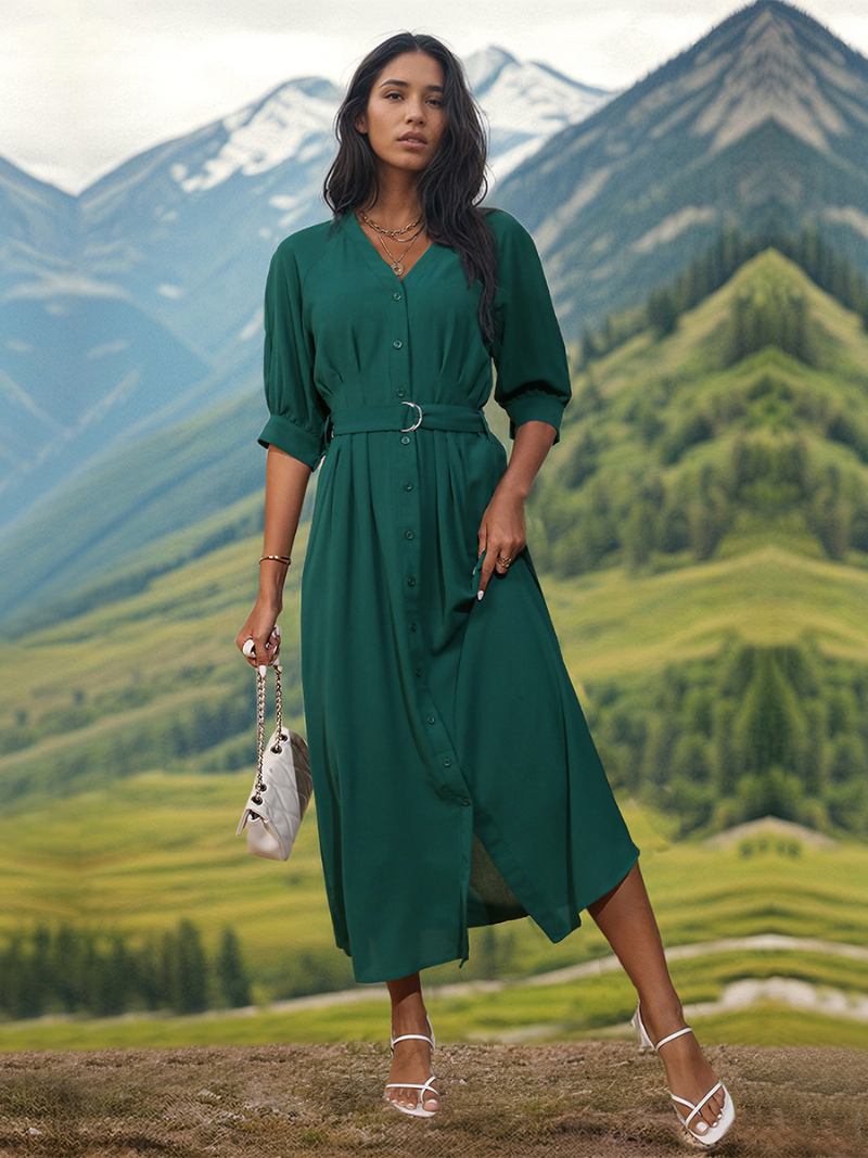 Vestido Feminino Com Decote Em V Botões Cinto Meia Manga Vestidos Maxi Casuais Para O Dia