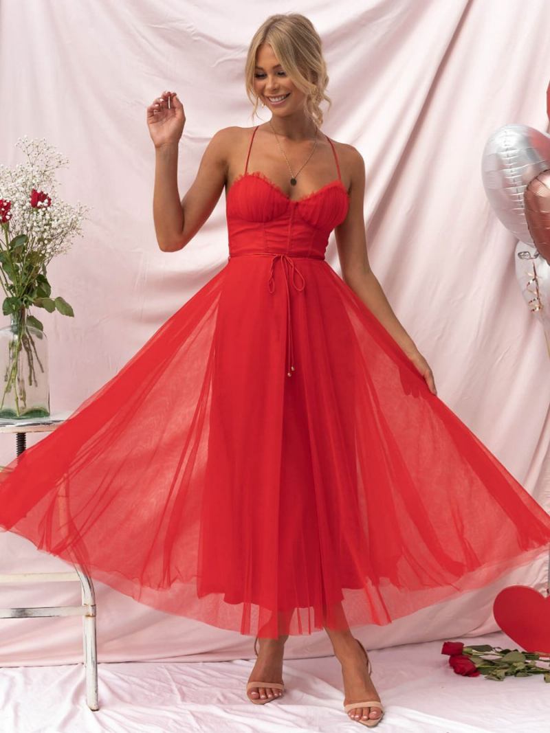 Vestido Feminino Corest Midi Com Alças Finas Franzido Cadarço E Saia Tule