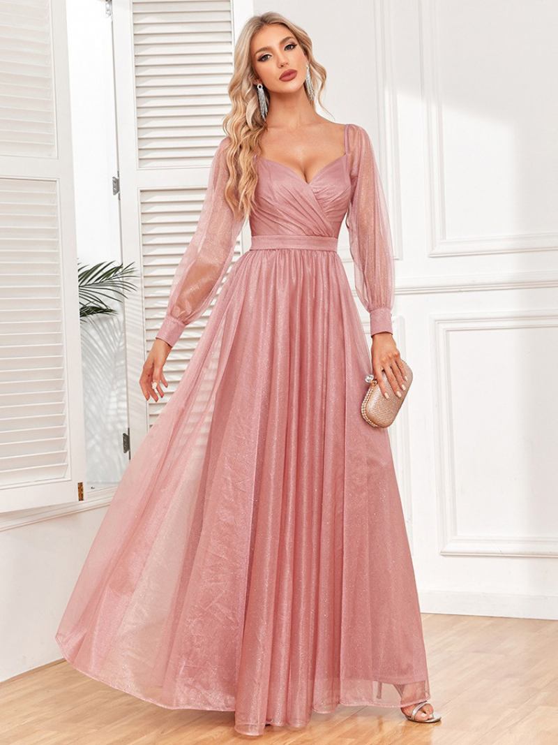 Vestido Feminino Elegante Baile Decote Em Sobrepeliz Mangas Ilusão Vestidos Maxi Rosa