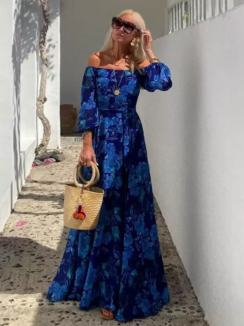Vestido Feminino Estampado Allover Com Ombros Fora Mangas Três Quartos Vestidos Maxi Casuais Primavera