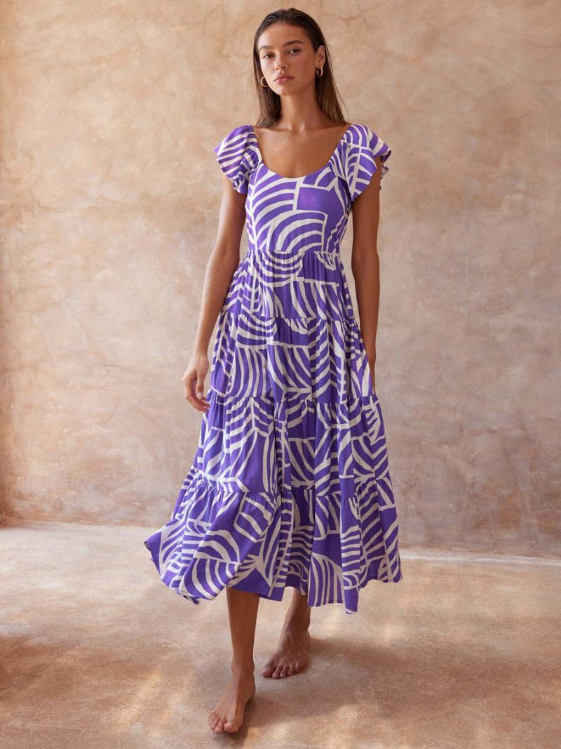 Vestido Feminino Estampado Em Camadas Mangas Decote Redondo Vestidos Midi Casuais Verão