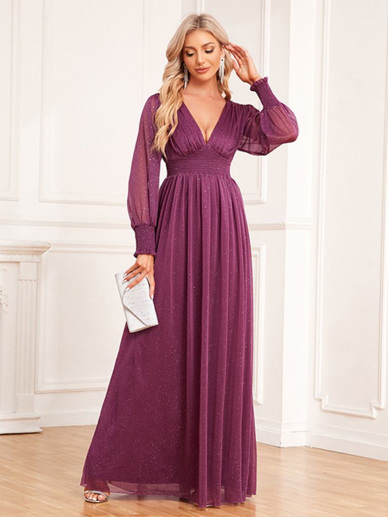 Vestido Feminino Ilusão Mangas Decote Em V Cintura Império Lantejoulas Vestidos Baile