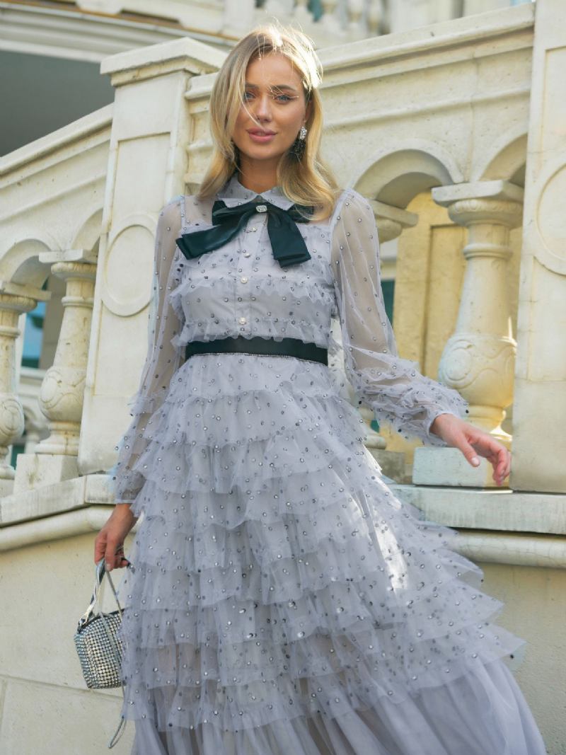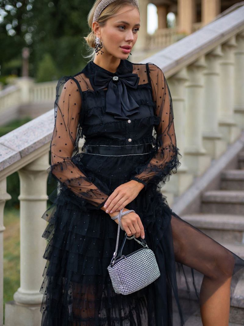 Vestido Feminino Preto Em Camadas Com Gola Alta Gravata Borboleta Bolinhas Vestidos Maxi Para Festa
