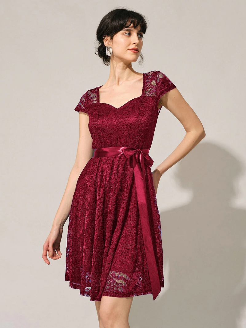 Vestido Feminino Renda Laço Faixa Querida Manga Curta Plissado Swing Retrô Festa Curto