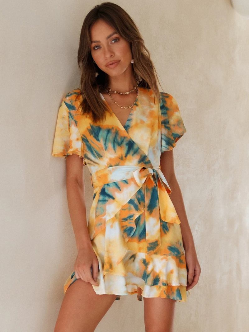 Vestido Feminino Tie-dye Envoltório Com Decote Em V E Mangas Curtas Casuais Vestidos Curtos Verão