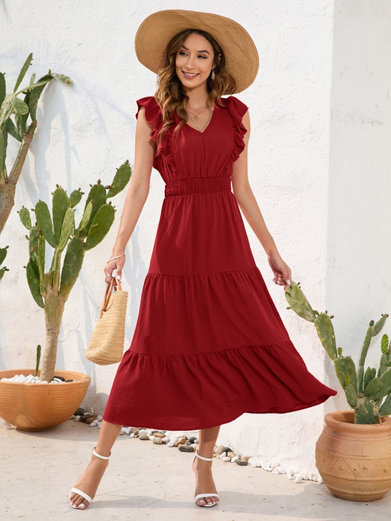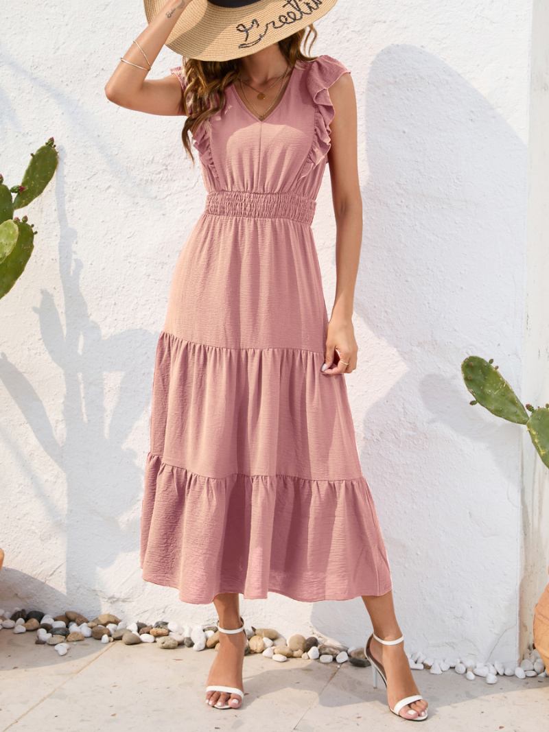 Vestido Feminino Verão Com Babados Em Camadas Sem Mangas Cintura Elástica Plissado Vestidos Midi Casuais