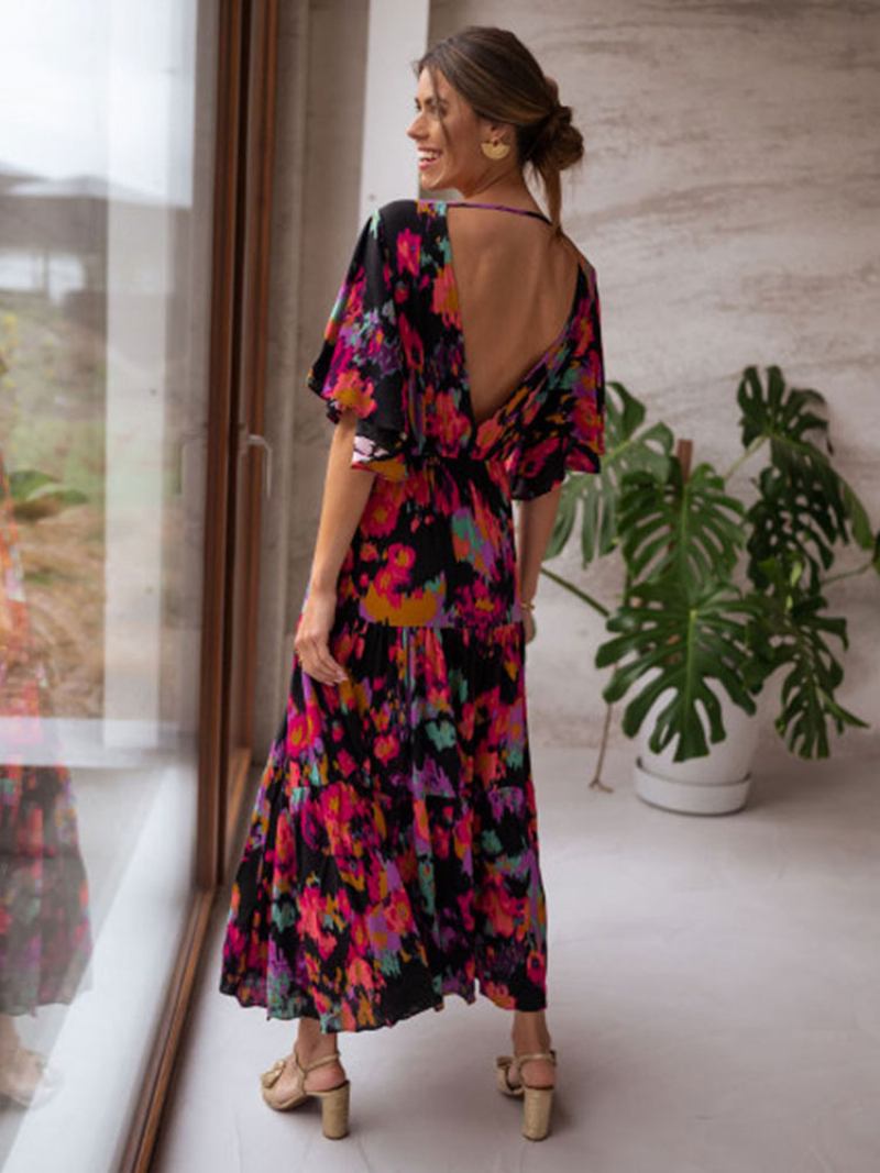 Vestido Feminino Verão Para Aniversário Preto Decote Em V Babados Estampado Praia