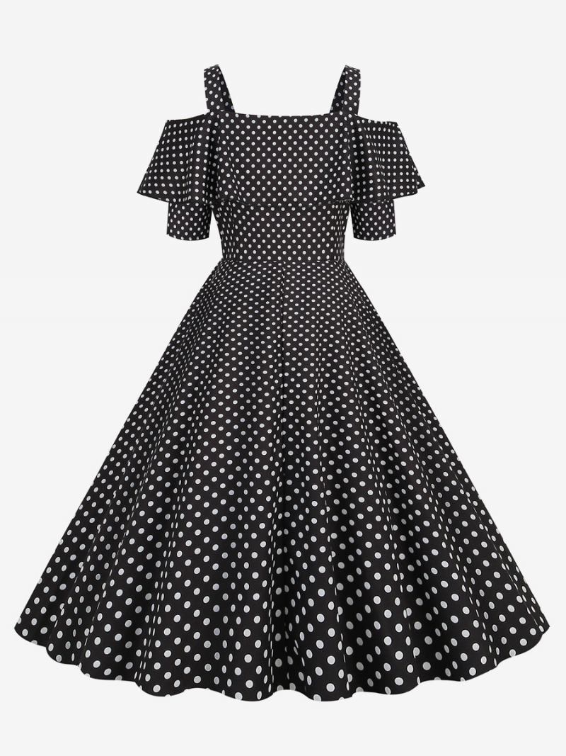 Vestido Feminino Vintage Dos Anos 1950. Decote Bateau Mangas Curtas Rockabilly Bolinhas Médias
