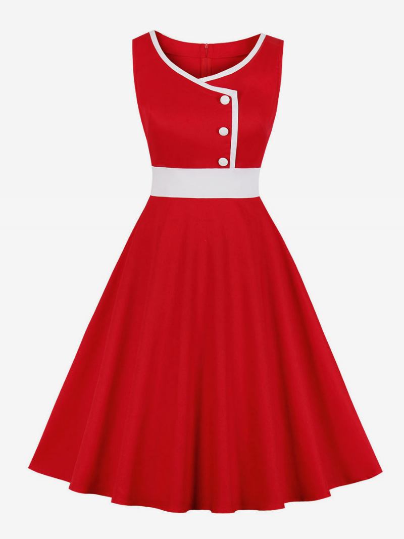 Vestido Feminino Vintage Estilo Audrey Hepburn Dos Anos 1950. Botões Em Dois Tons Sem Mangas Decote Coração Vermelho Swing