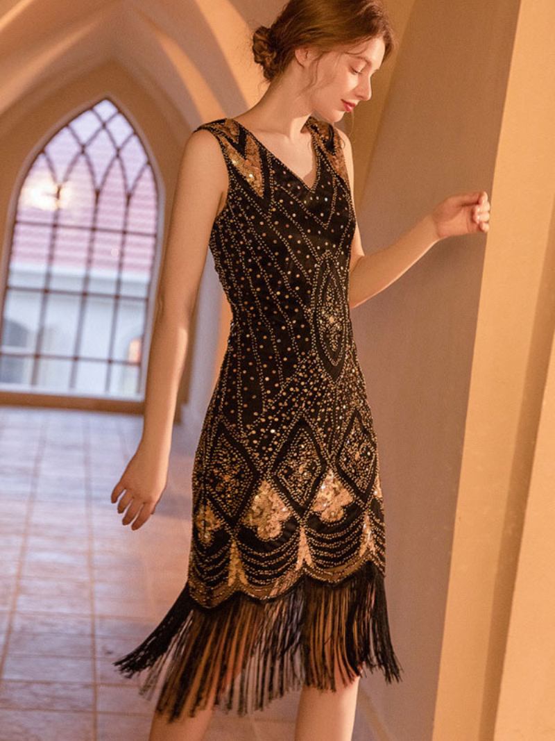 Vestido Feminino Vintage Sem Mangas Midi Com Decote Em V Franja Lantejoulas Vestidos Festa Aniversário