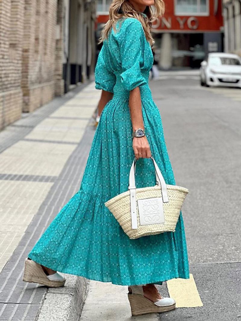 Vestido Floral Feminino Com Decote Em V Plissado Boêmio Diário Casual Maxi Vestidos