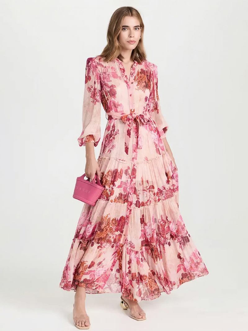 Vestido Floral Feminino Maxi Vestidos Estampa Mangas Compridas Gola Joia Chique Faixa Zíper Longo Verão