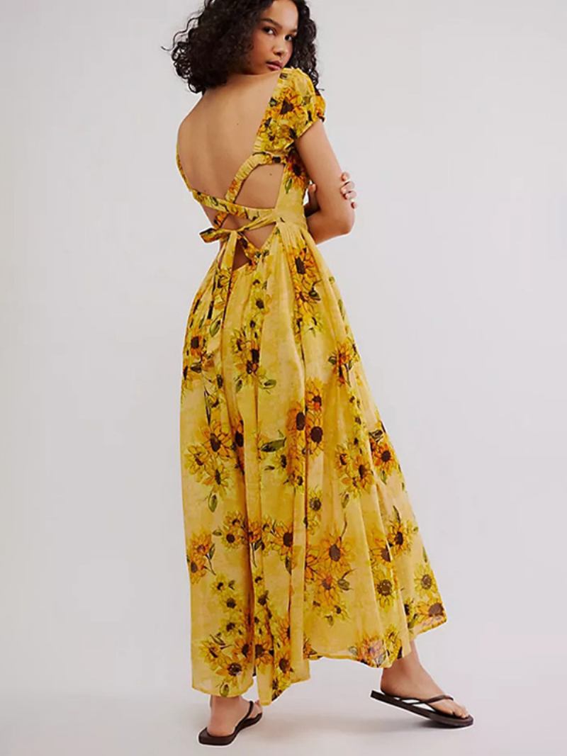 Vestido Floral Feminino Maxi Vestidos Estampa Mangas Curtas Jóia Pescoço Chique Sem Costas Rendas Costura Aberta Longo Verão