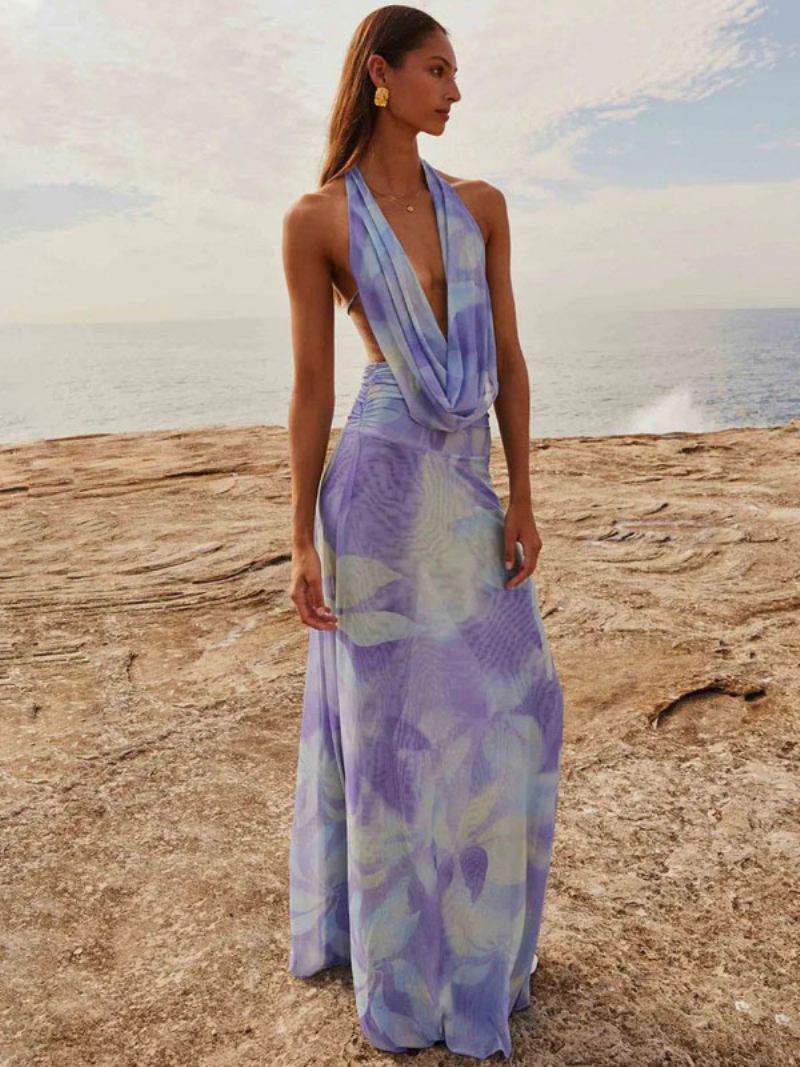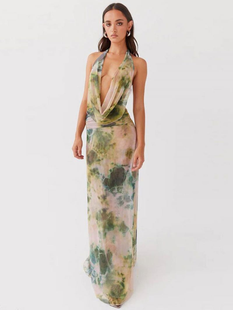 Vestido Floral Feminino Maxi Vestidos Estampa Sem Mangas Decote Em V Chique Plissado Costura Aberta Longo Outono