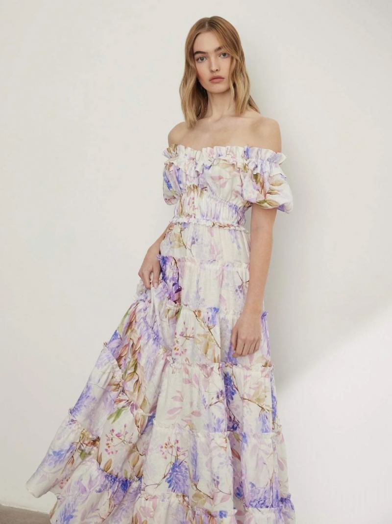 Vestido Floral Feminino Vestidos Maxi Estampa Sem Alças Em Camadas Babados Gola Bateau Mangas Curtas Costura Aberta Chique Outono Longo