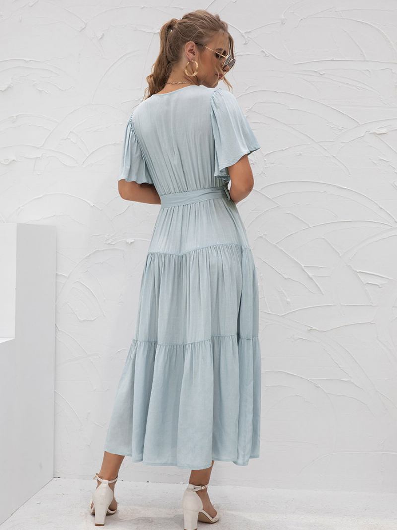 Vestido Maxi Feminino Com Decote Em V Mangas Curtas Casual Camadas Até O Chão