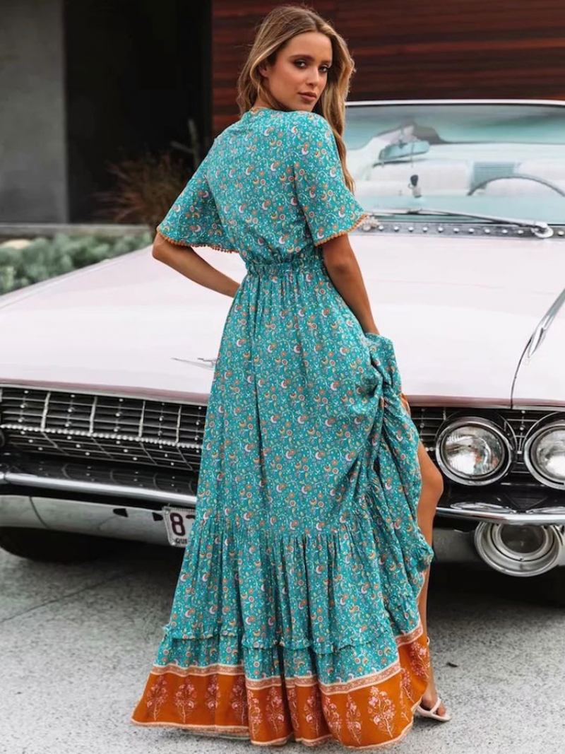 Vestido Maxi Feminino Com Decote Em V Mangas Curtas Longo Estampado