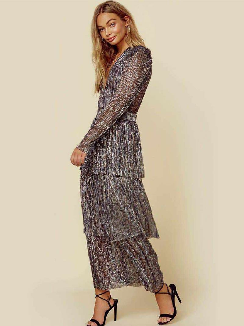 Vestido Maxi Feminino Em Camadas Com Mangas Ilusão Mergulho Vestidos Baile Ombro Forte