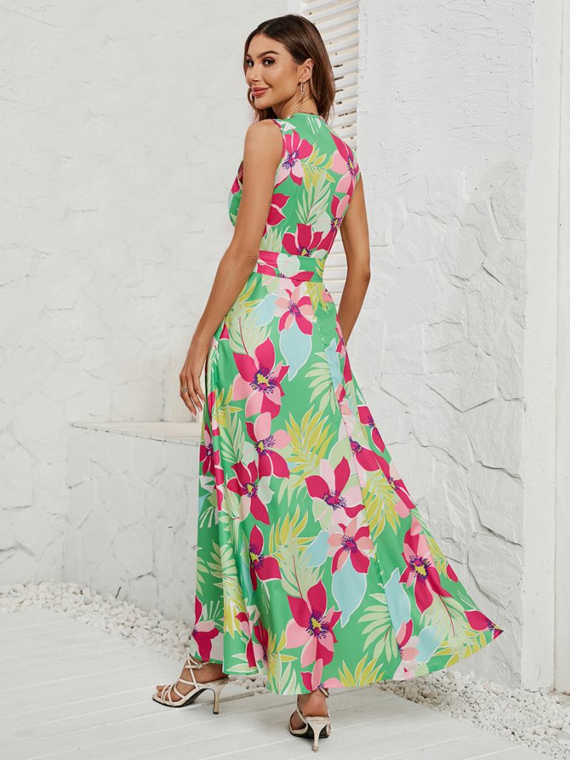 Vestido Maxi Feminino Floral Com Decote Em V Cinto Sem Mangas Vestidos Longos Assimétricos