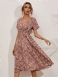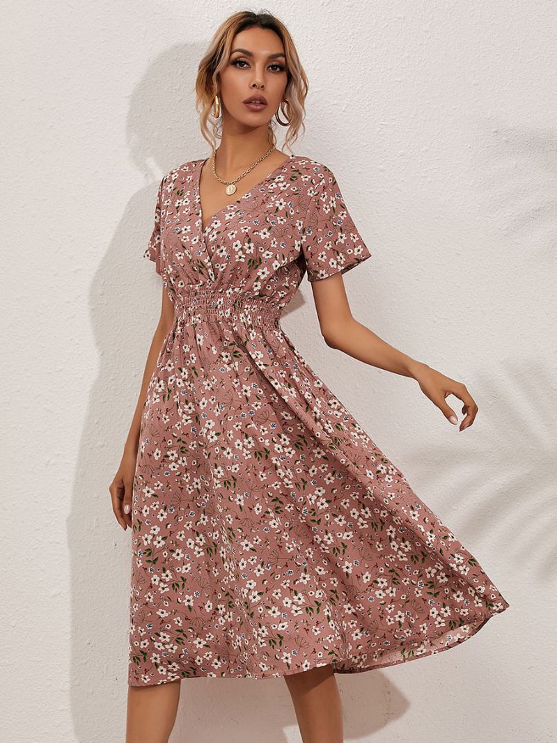 Vestido Midi Feminino Com Decote Em V Manga Curta Estampado Floral Chique Verão