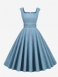 Vestido Retrô Feminino Dos Anos 1950 Audrey Hepburn Estilo Bebê Azul Debruado Sem Mangas Gola Quadrada Rockabilly Médio