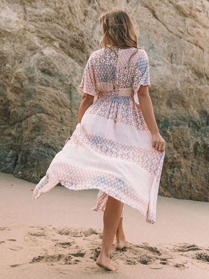 Vestido Verão Feminino Com Capa Rosa Decote Em V E Estampa Floral Praia