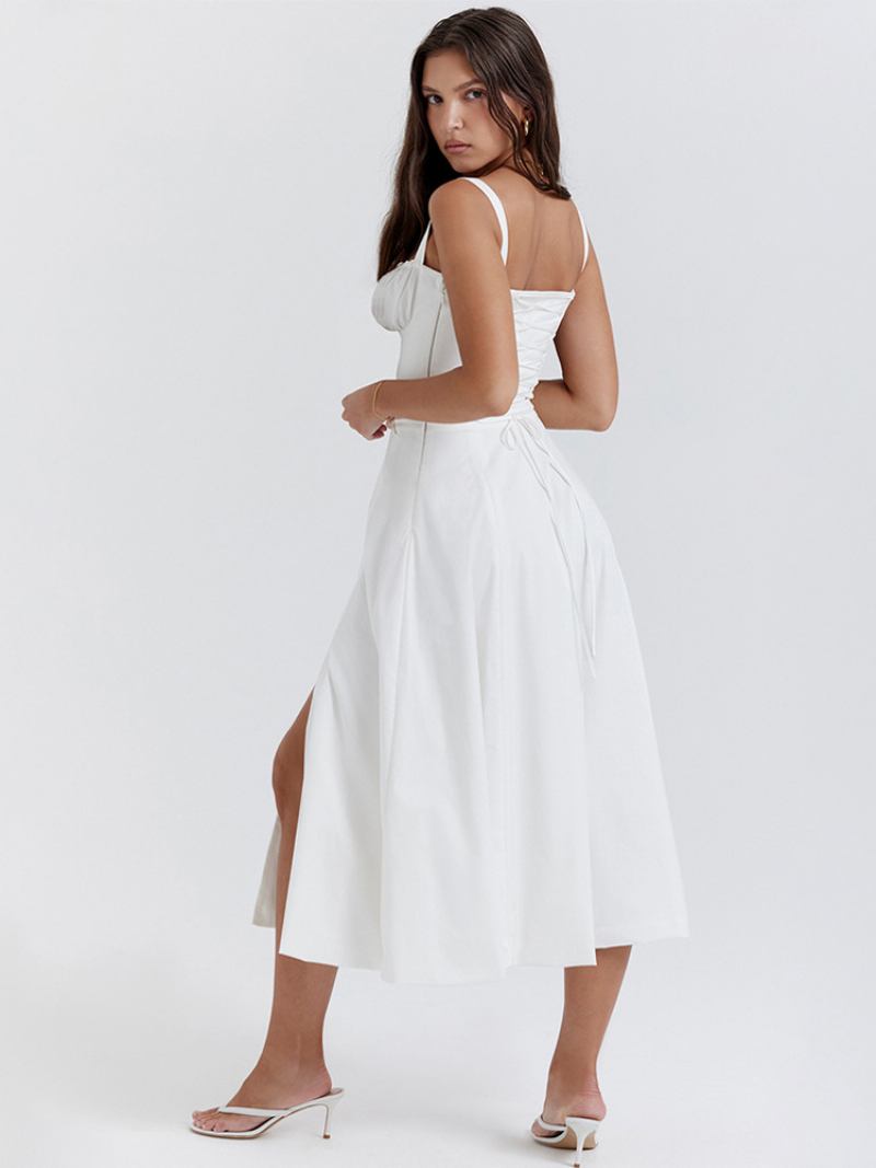 Vestido Verão Sem Mangas Com Alças No Pescoço Chique Midi Cadarço Para Mulheres