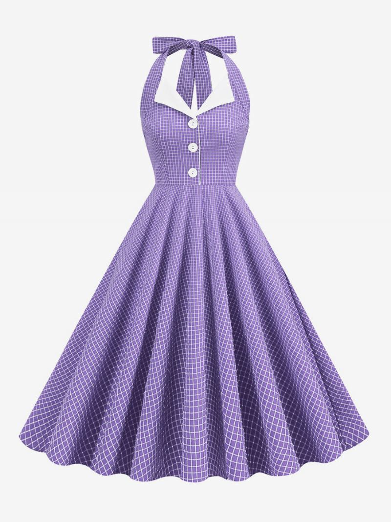Vestido Vintage Anos 50 Audrey Hepburn Estilo Halter Botões Sem Mangas Feminino Médio Xadrez Rockabilly