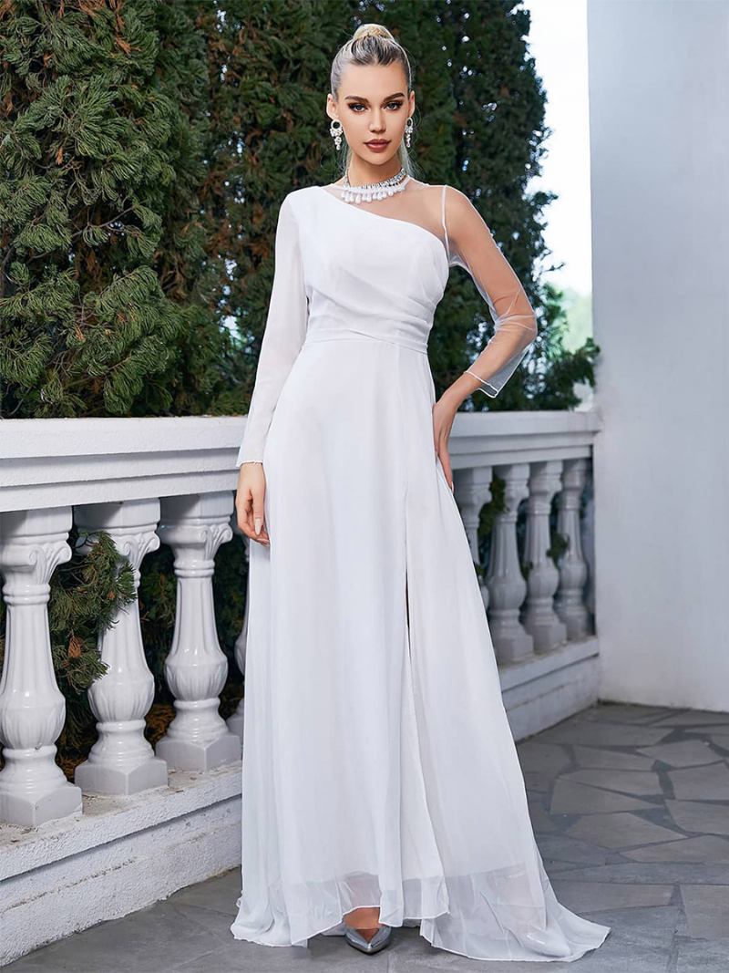 Vestidos Baile Assimétricos Femininos Mangas Compridas Coquetel Maxi Vestido Branco