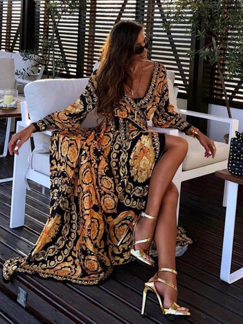 Vestidos Boho Maxi Mangas Compridas Estampadas Com Decote Em V Vestido Longo Para Mulheres