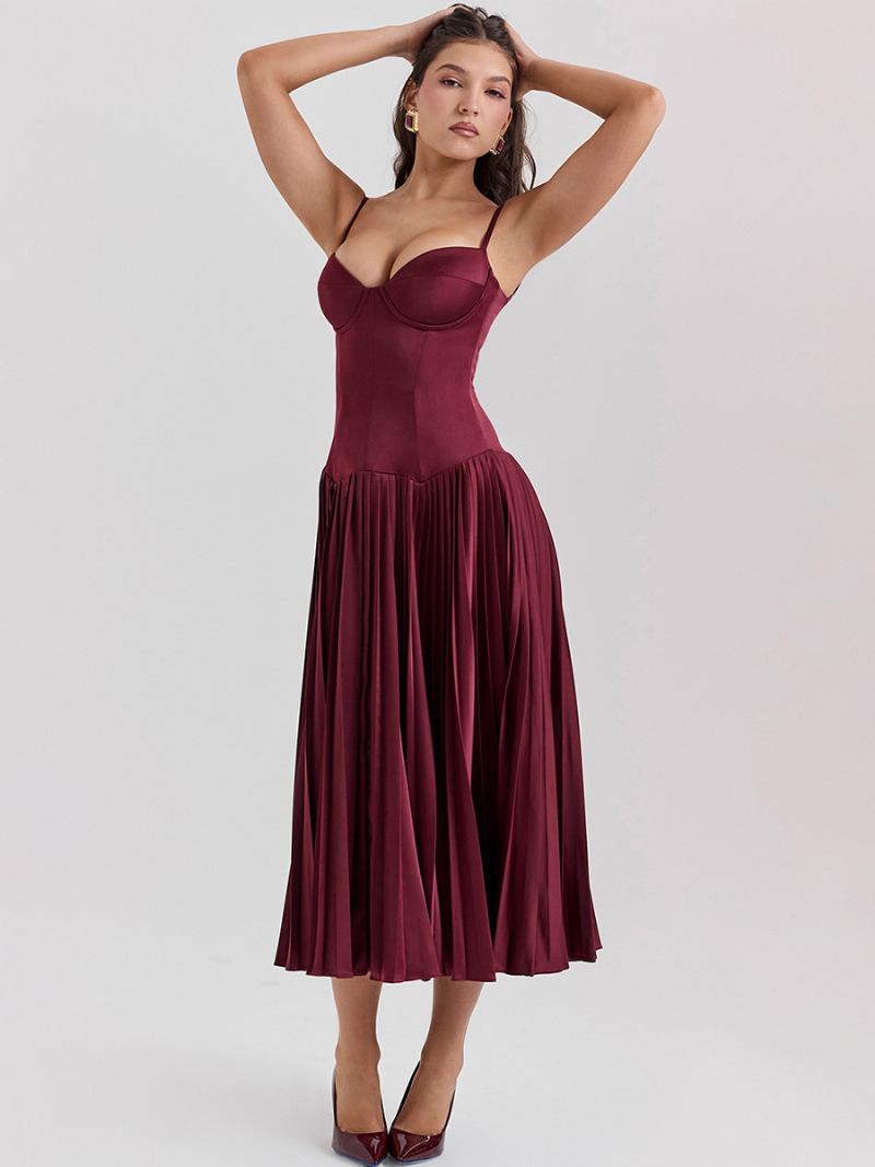Vestidos Festa Femininos Borgonha Com Alças No Pescoço Plissado Sem Mangas Vestido Semi Formal