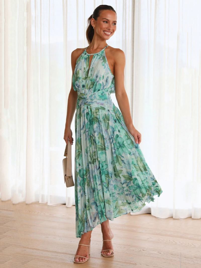 Vestidos Maxi Femininos Estampados Florais Sem Mangas Frente Única Elegante Em Camadas Plissadas Costas Longos Verão
