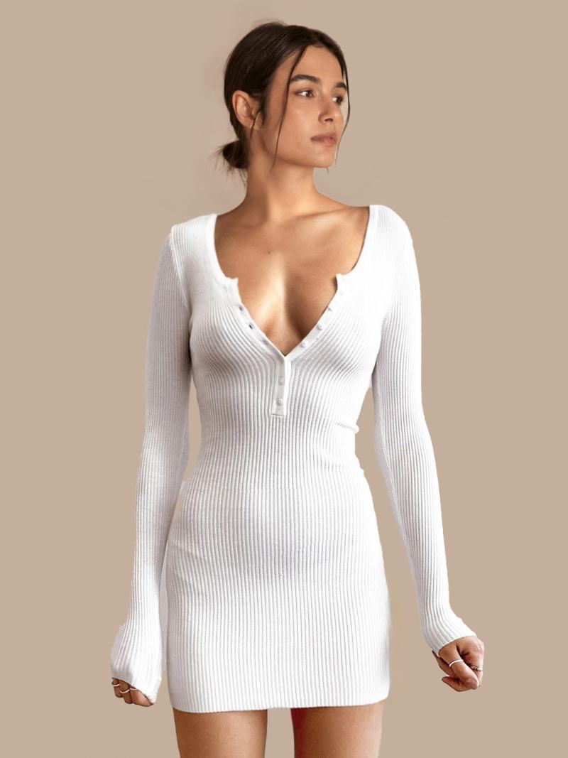 Vestidos Suéter Femininos Brancos Com Decote Em V Bodycon Casuais Mangas Compridas Vestido Lápis Malha